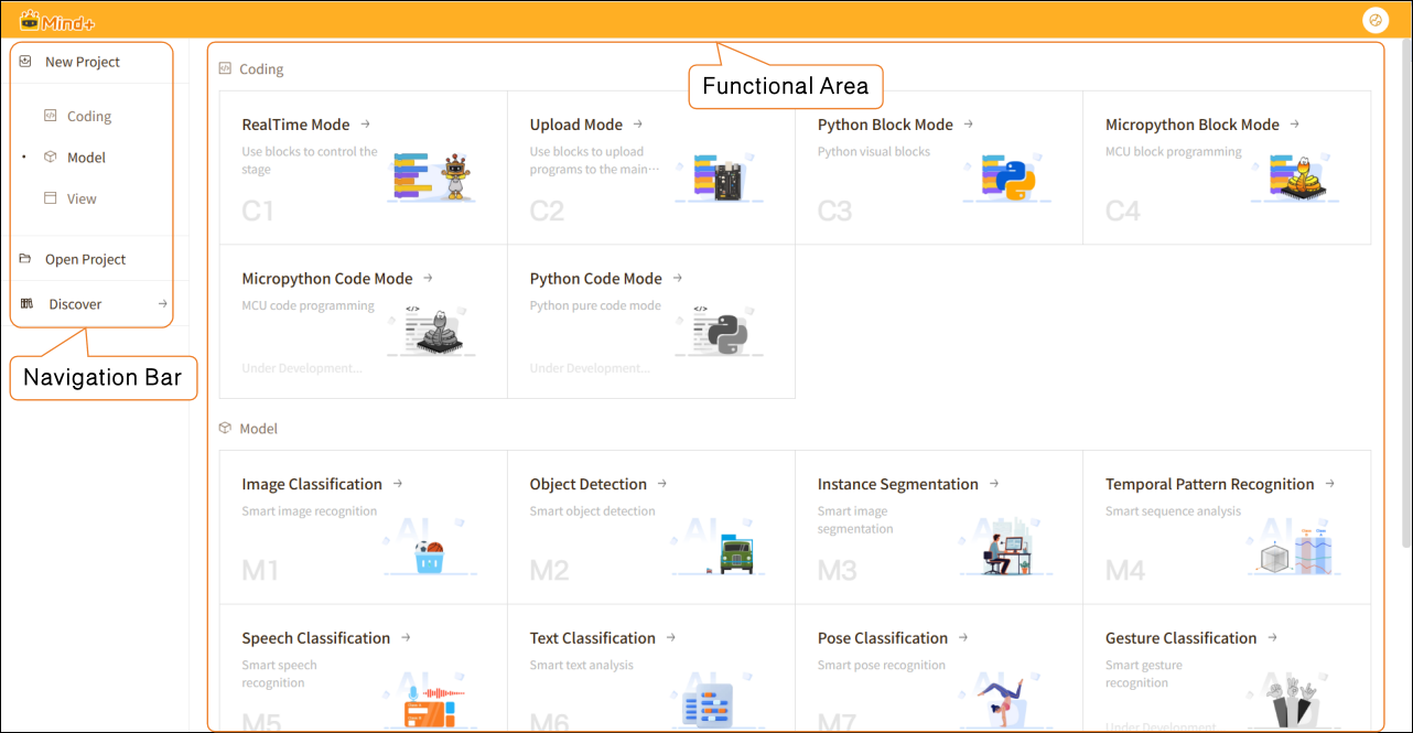 The new version of the Mind+ main interface adopts a left-side navigation bar + right-side functional area layout, providing clear partitioning and intuitive operation, which allows users to quickly create and manage projects. The overall design is clean and straightforward, mainly using a card-style display, with all functional entrances clearly visible.