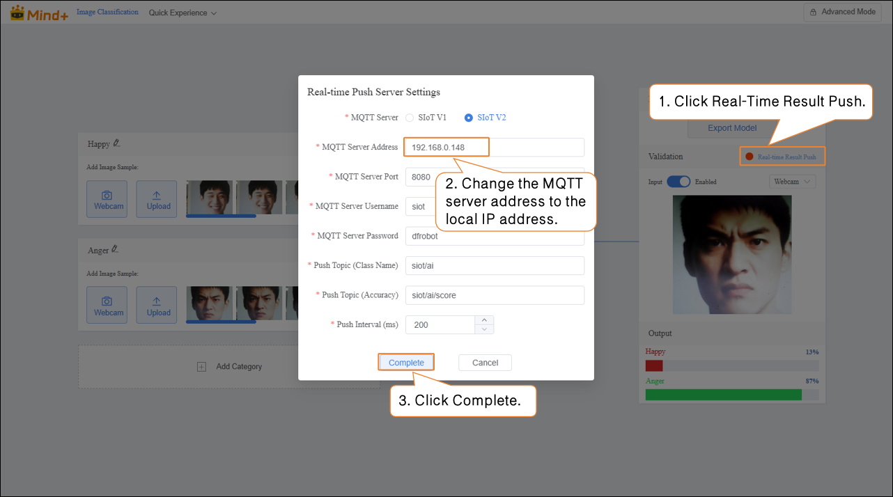 - After the model validation is completed and meets the requirements, click “Real-Time Result Push.” In the “Real-Time Push Server Settings,” change the MQTT server address to the local IP address (can be viewed in the Data Transmission Tool).