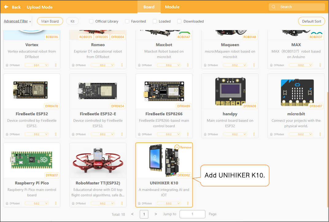 - Add Main Controller: Click “Extensions,” then in “Board,” download and add “UNIHIKER K10.”