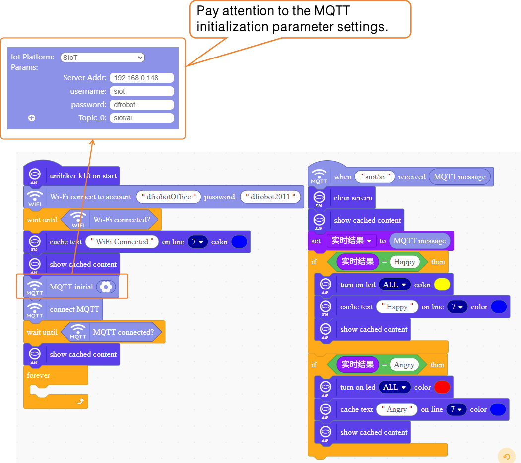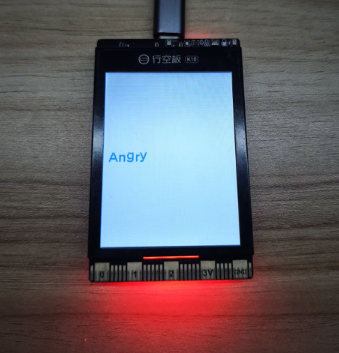 Receive real-time result messages pushed to MQTT and analyze the MQTT messages. If the MQTT message is "happy," the RGB light on the UNIHIKER K10 will display yellow; if the MQTT message is "angry," the RGB light on the UNIHIKER K10 will display red.