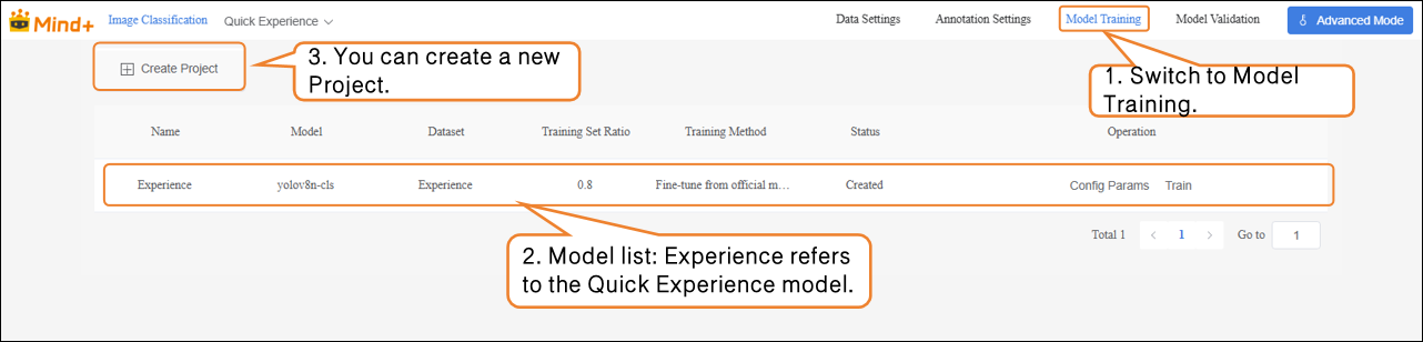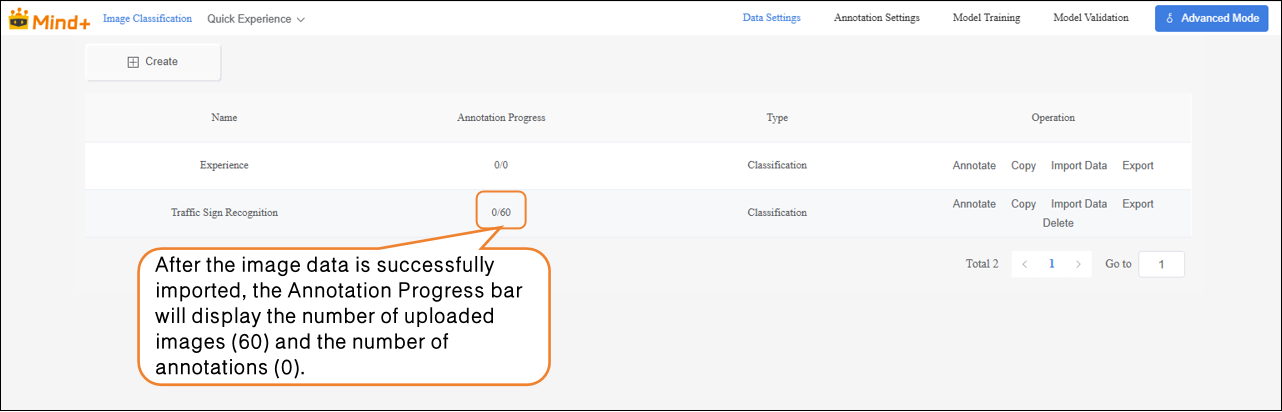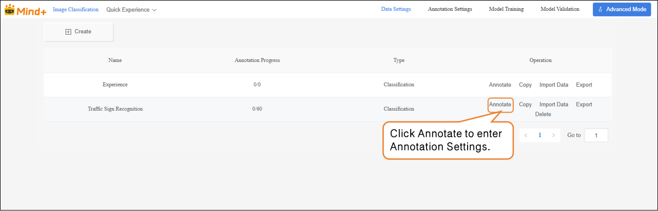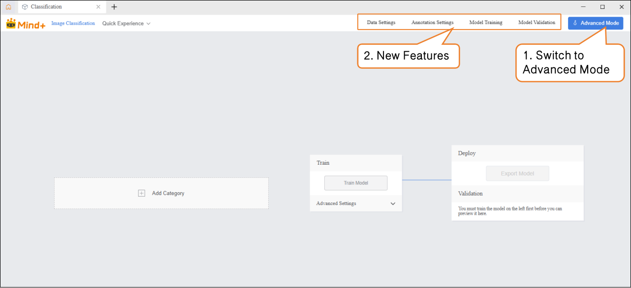 - Click "Advanced Mode" in the top-right corner of the interface to switch modes. Once switched successfully, the menu bar will add the following modules: Data Settings, Annotation Settings, Model Training, and Model Validation.