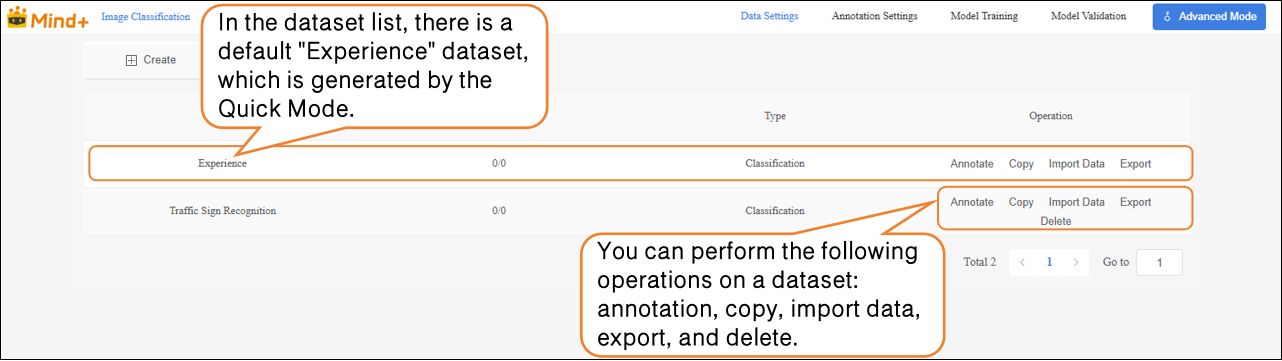 - After switching to Advanced Mode, the dataset list will display a default "Experience" dataset, which is generated from the Quick Experience mode. Users can perform the following operations on newly created datasets: annotation, copy, import data, export, and delete.
