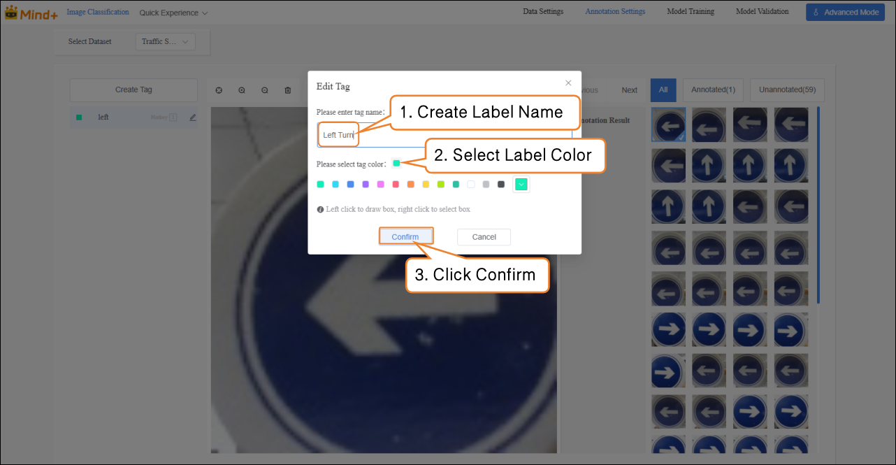 - Follow the on-screen instructions to create labels (Left Turn, Right Turn, Straight) for annotating different types of traffic signs.