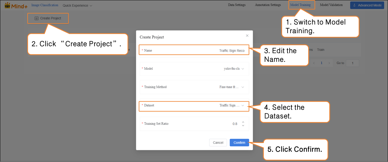 - Name: Traffic Sign Recognition Model (rename as needed) Model: Select according to your needs (default is also fine) Training Method: Select according to your needs (default is also fine) Dataset: Traffic Sign Recognition (in Data Settings, we have already created and named the dataset “Traffic Sign Recognition”; in Annotation Settings, all images have been annotated and organized. At this point, the data has the complete structure required for training. Next, the system will extract features and learn patterns from this dataset, gradually enabling classification and recognition of traffic signs. Therefore, the dataset must be set to Traffic Sign Recognition.) Training Set Ratio: Select according to your needs (default is also fine)