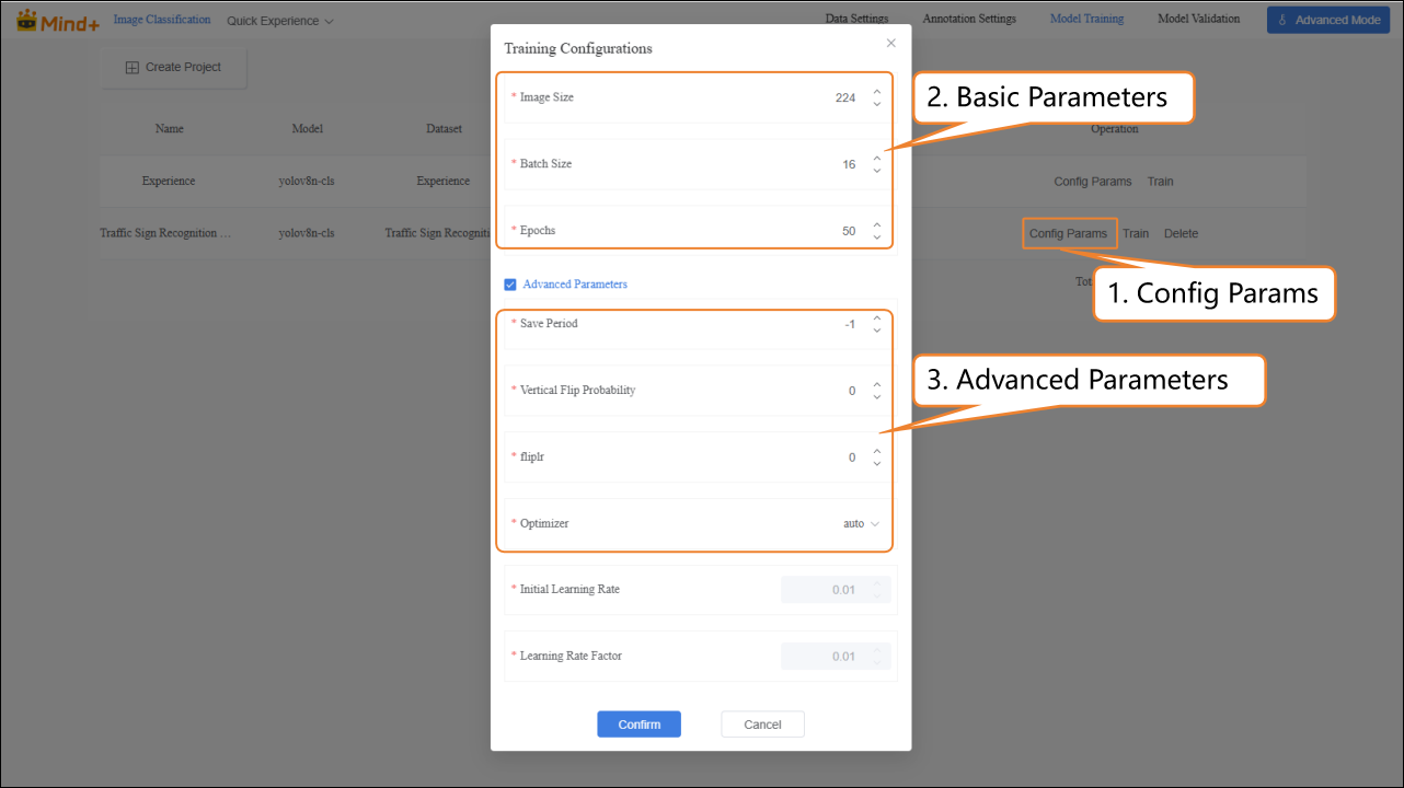 - Advanced Parameters: Advanced Parameters: Save Period, Vertical Flip Probability, fliplr, Optimizer, etc.
