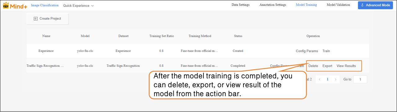 - After the model training is completed, you can delete, export, or view result of the trained model from the operation bar.