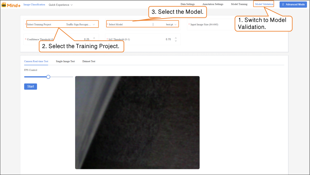 - Switch to the Model Validation module, select the training project: Traffic Sign Recognition Model; select the model: best.pt. Other parameters can be set according to your needs, or you can use the default settings.