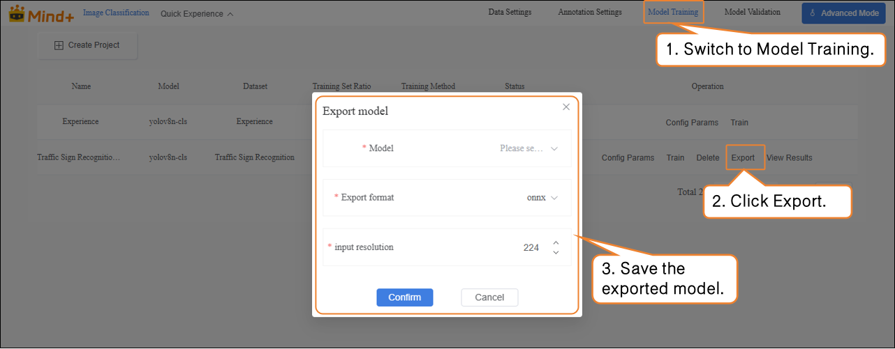 - When the model test results meet your requirements, switch to the Model Training module to export the model.