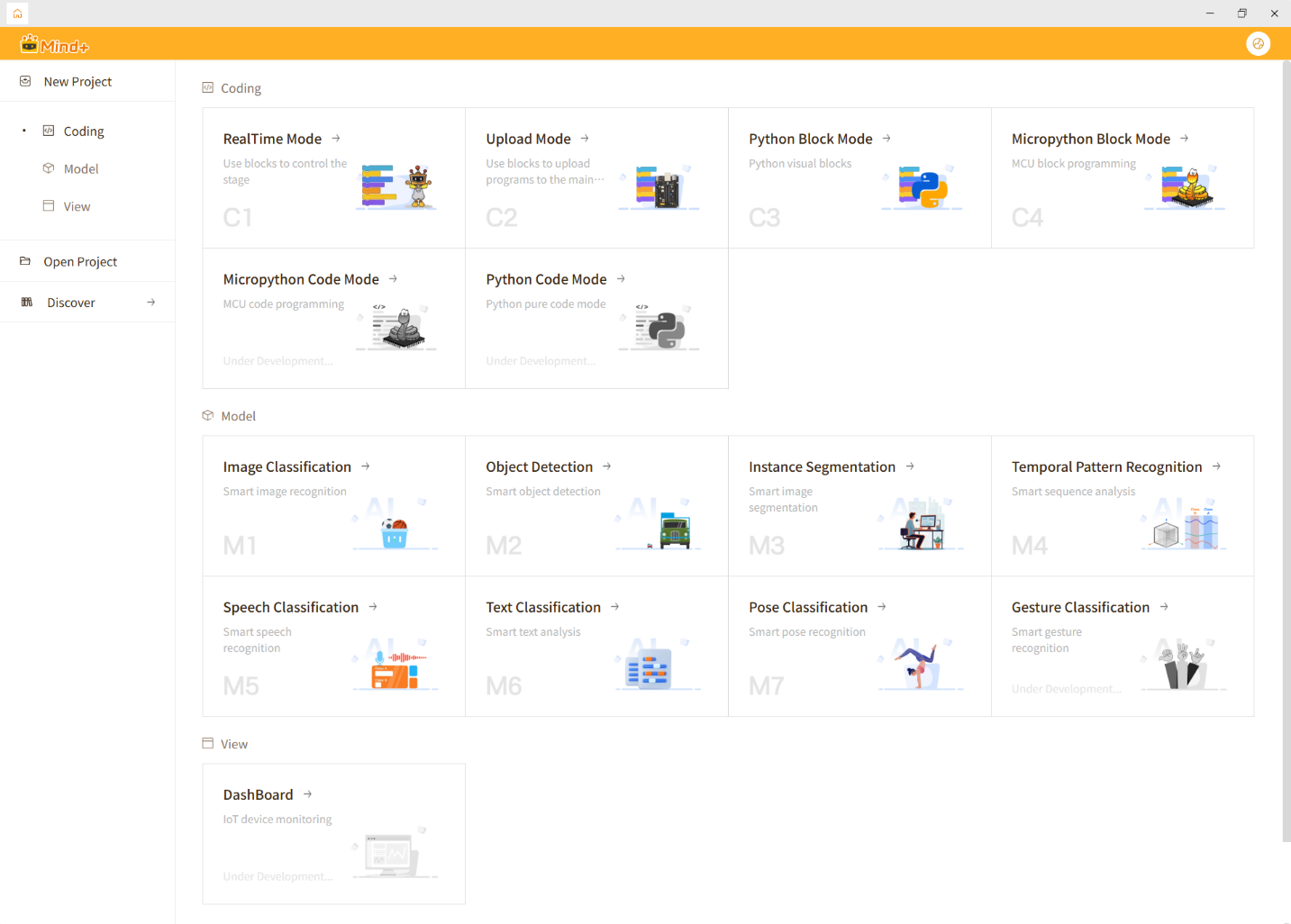 | Model Training | AI learning and training platform of Mind+ | In this function, you can collect data, annotate samples, and train your own AI models to achieve intelligent functions such as image recognition, sound recognition, and time series pattern recognition. Trained models can also be linked with the program design module, giving works the ability to "recognize", "judge", and "learn". |